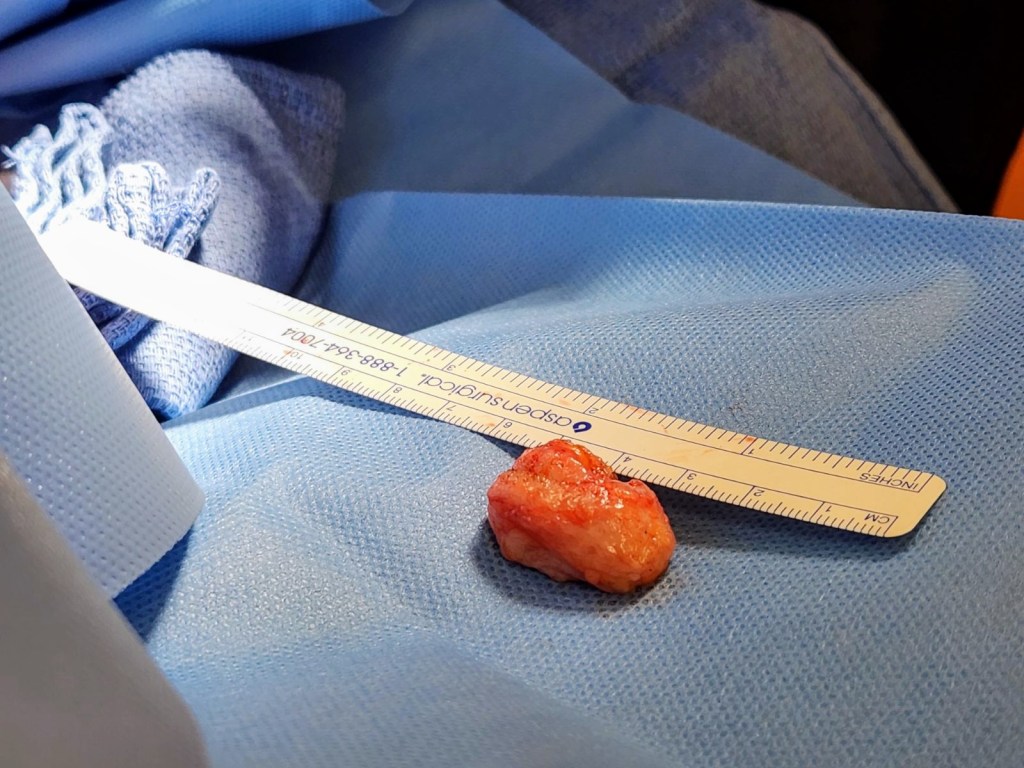 The typical length of this kind of surgery is 20 mins. Today lasted closer to an hour. The tumor was much deeper than expected and fibrous. Took many shots of lidocane and cutting to take out. The surgery itself was not very painful. Just nerve wracking. Lots of pressure and the smell of burning flesh during cauterization. I sat there clammy and slightly shaky the entire time from the fight, flight or freeze response. My go to is usually freeze.